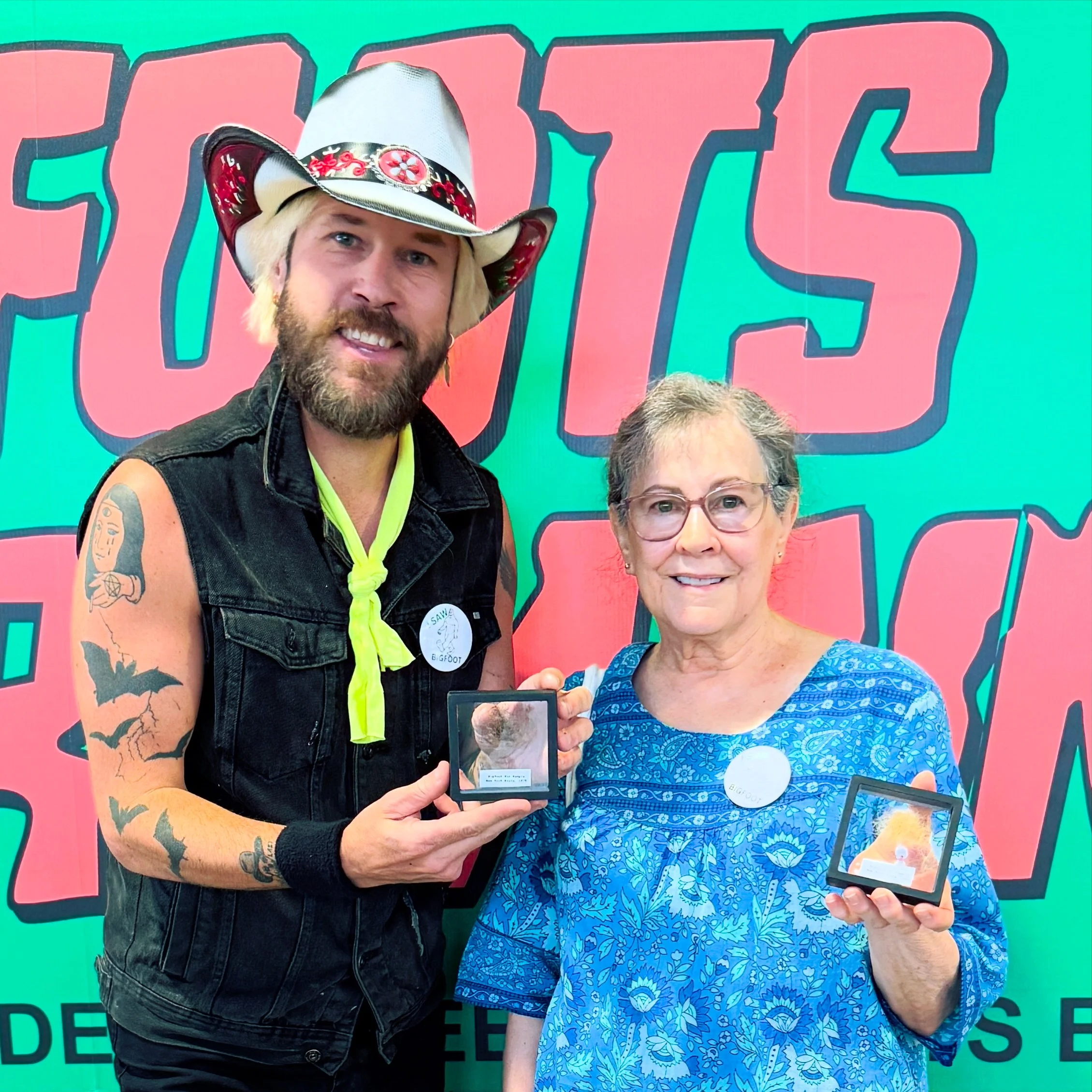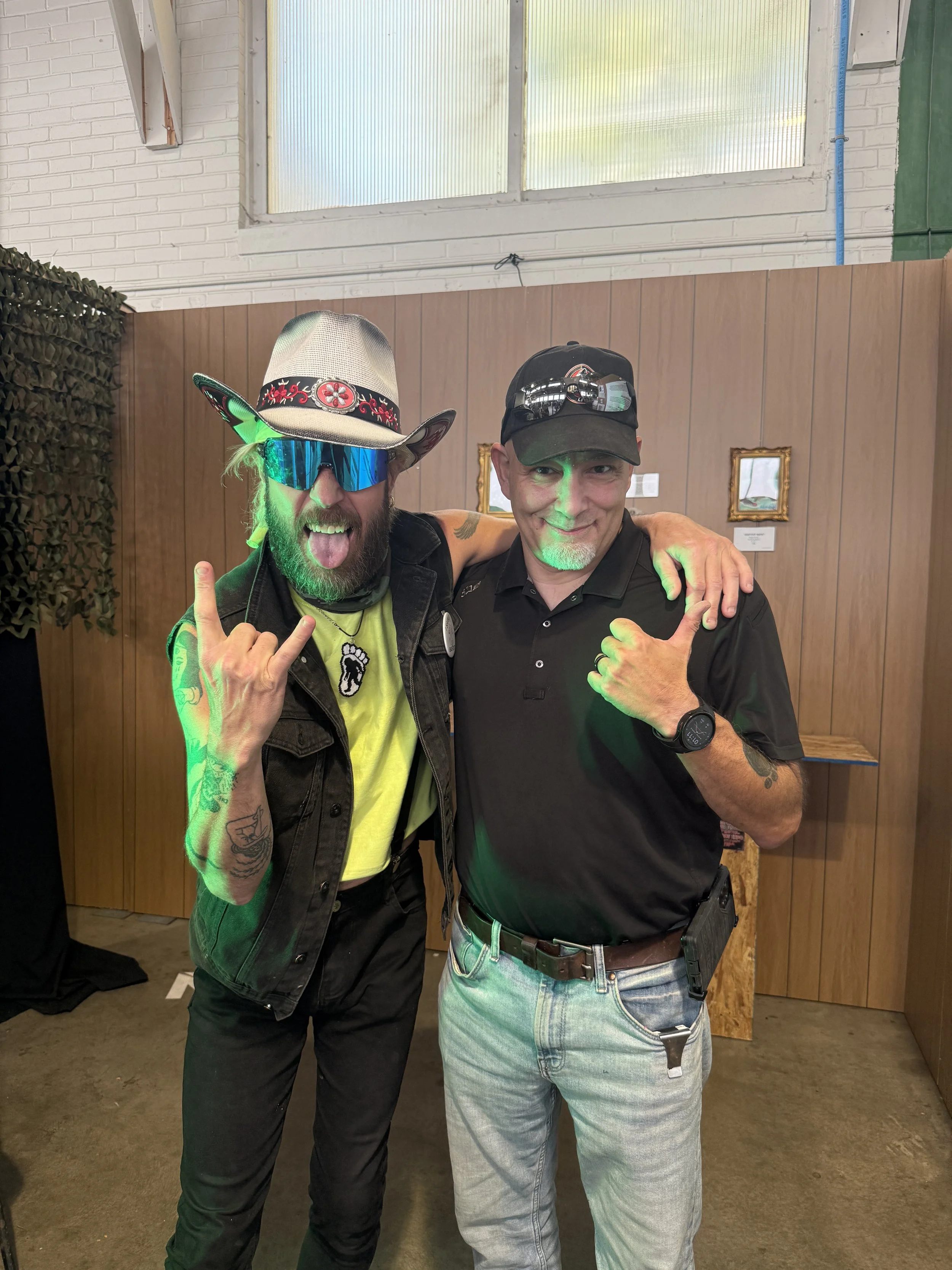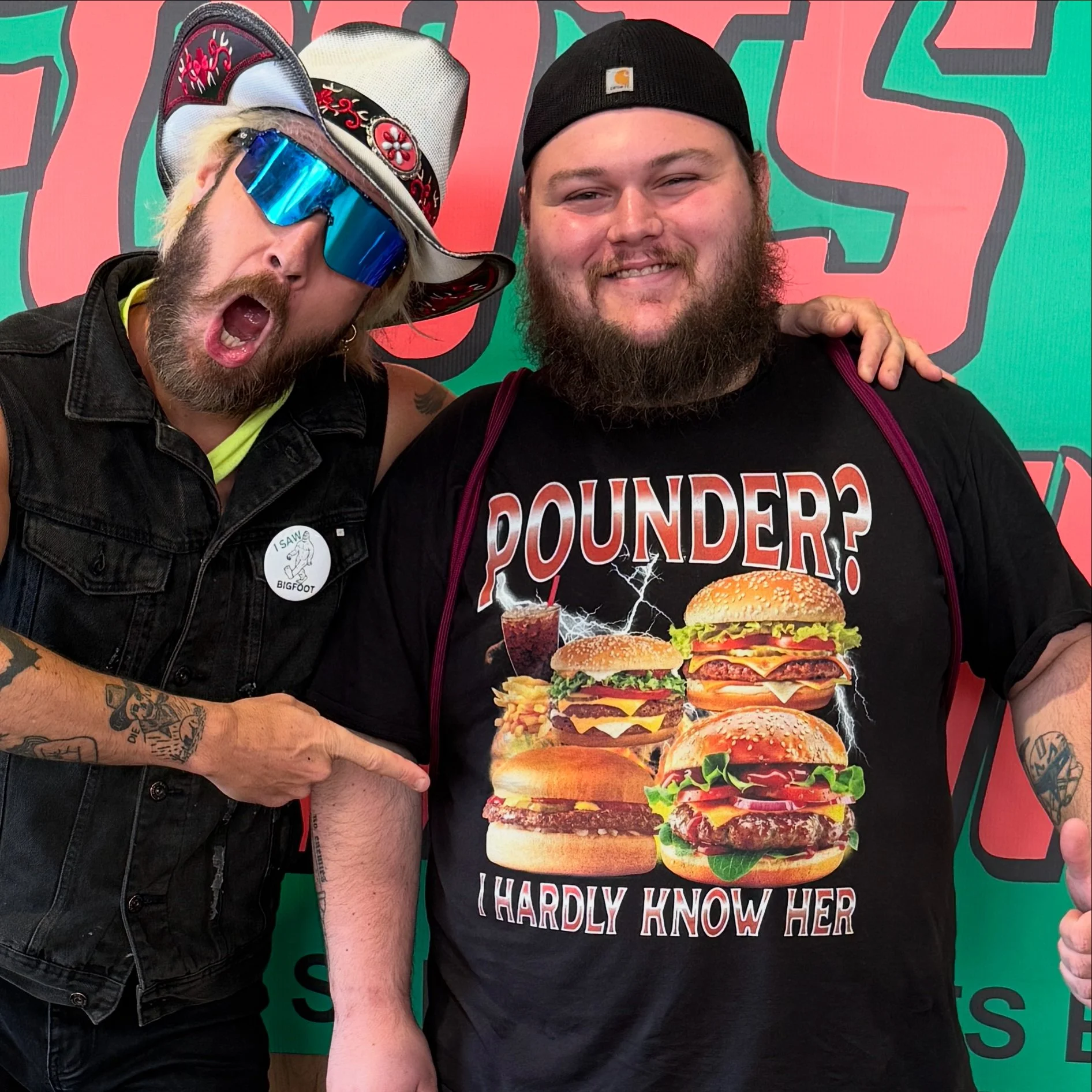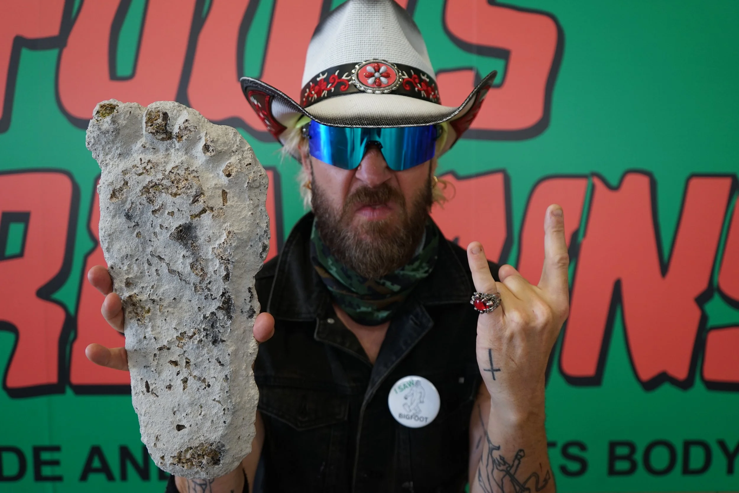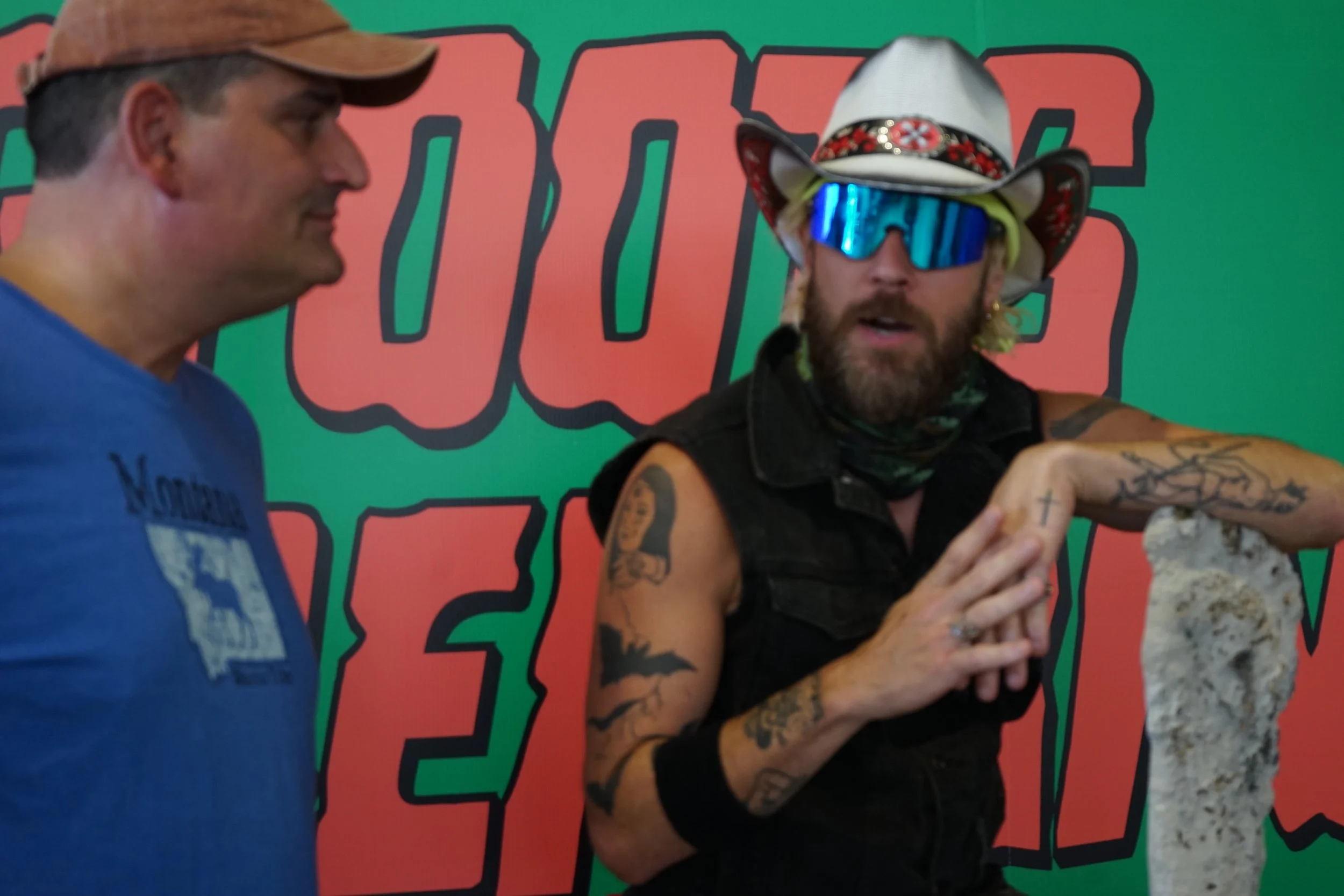 A man with a beard wearing a cowboy hat, mirrored sunglasses, and a black vest, holding a large rock in one hand and making a rock on sign with the other, in front of a green background with red and black text.